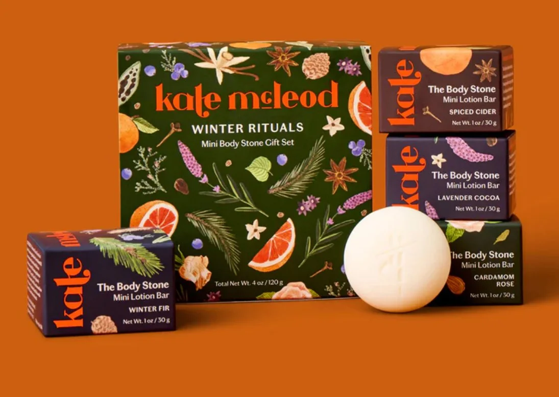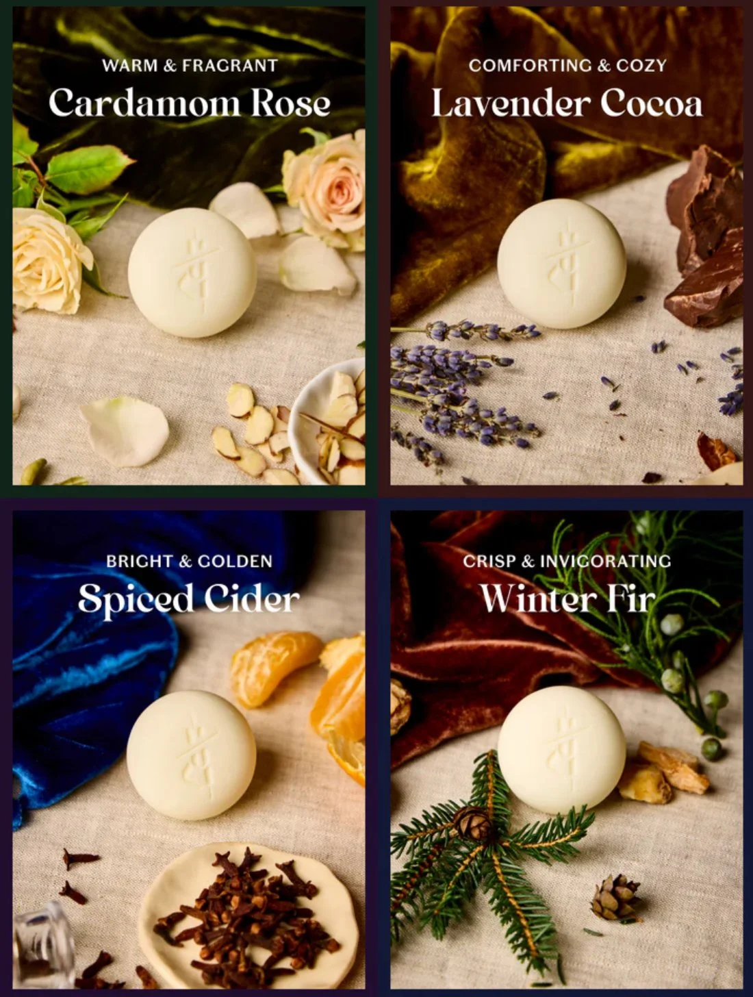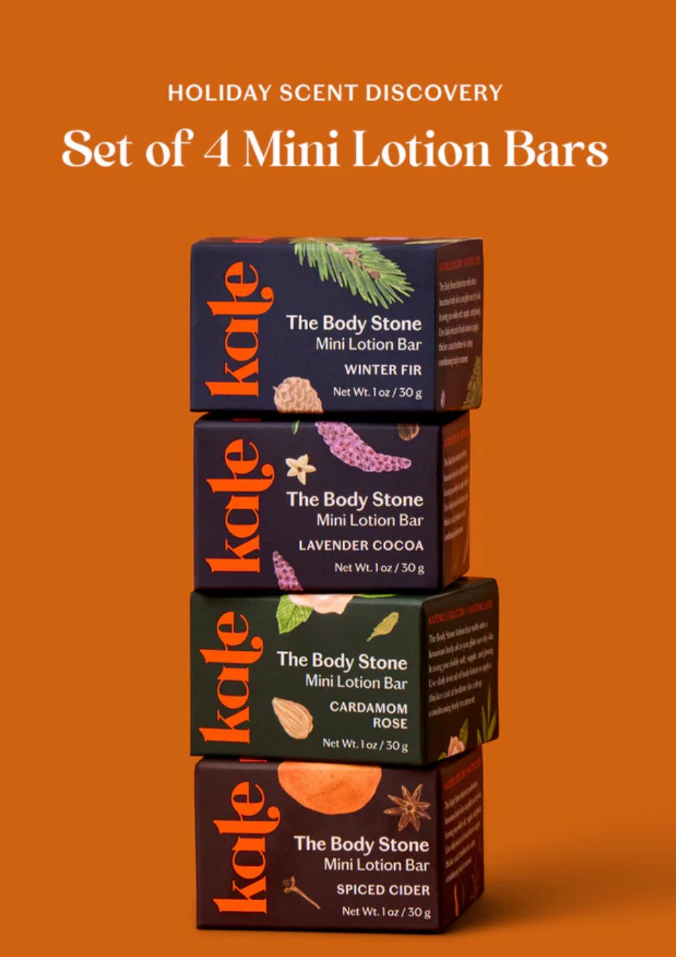 This indulgent sampler set features four freshly batched winter scents in mini sizes. Lavender Cocoa, Cardamom Rose, Spiced Cider, and Winter Fir create a sensory journey through the season’s most cherished moments. Keep the full set or split it up to add a little joy to every stocking. Each mini Body Stone delivers rich, lasting hydration and care grounded in scent and memory.